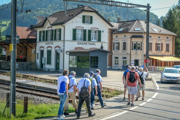 Die Nietenverlosung zur oben erwähnten Abendunterhaltung war sehr spannend. Ein Preis davon war ein persönliches Ständli am Wohnort des Gewinners. Nur wohnte der Gewinner für einmal nicht in Wallisellen. So besammelten sich am letzten August-Samstag 12 Sänger am Bahnhof Wallisellen. Vorerst ging es mit Zug und Bus nach Bäretswil.