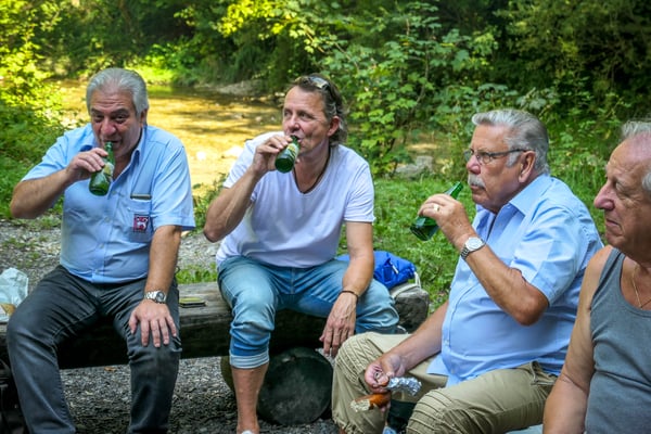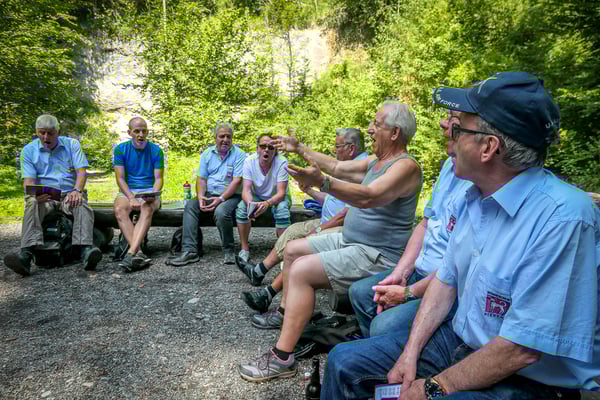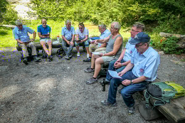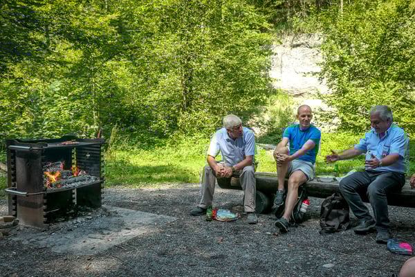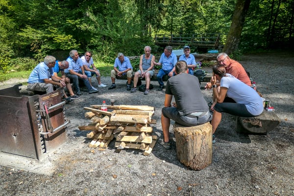 Da begann die Wanderung durch ein selten schönes und prächtiges Tobel. Auf gutem Wanderweg erreichten wir bald einmal den Wasserfall "Grosser Giessen". Weitere Abklärungen ergaben, dass das ganze Tobel früher der Kraftgewinnung für Spinnereien und Mühlen diente. Nicht mehr lange dauerte es dann bis zur Mittagsrast. Unser umsichtiger Präsident hat seinen Sohn mit Familie eingespannt, die für uns ein währschaftes Feuer entfachten. Da schmeckten die mitgebrachten Würste und Steaks doppelt gut. Auch für Getränke war gesorgt. Bald ging es aber weiter nach Wetzikon bis zum Schulhaus Walenbach wo wir dann die restlichen Sänger, die mit dem Auto kamen erwarteten.