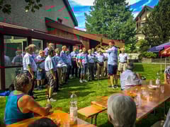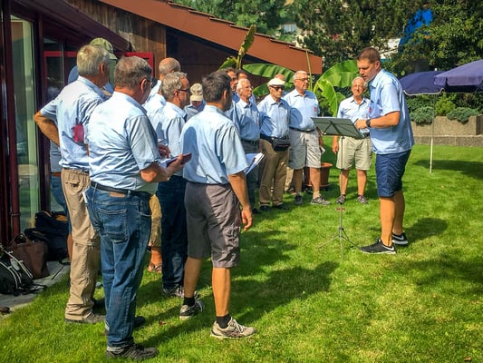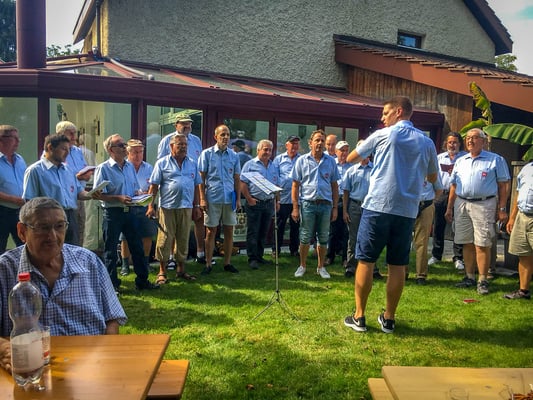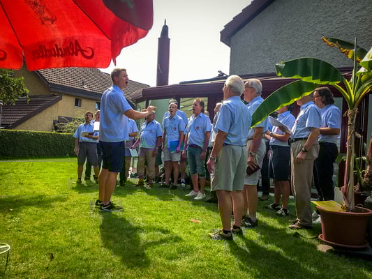 Mit 23 Sängern marschierten wir dann geschlossen zum Gewinner des Preises. In einem schönen Einfamilienhaus erwartete uns der Gastgeber, der im Garten schon einige Nachbarn und Freunde eingeladen hatte. Das Wetter war sehr angenehm, und das Ständli vom Chor gelang ausgezeichnet. Dafür verantwortlich war unser Vizedirigent Bob Sasek. Er hatte mit seinen enormen Fortschritten den Chor gut im Griff. Auch die gut 2 Dutzend Gäste verdankten den Vortrag mit großem Applaus. Dass die Sänger vom Männerchor Rieden keine Kostverächter sind, weiß man ja seit langem. Irgendwie bemerkte dies auch der Gewinner des Preises. In seinem fest installierten Pizzaofen im Garten verwöhnte er Sänger, Gäste, Familienangehörige bis am frühen Abend. Auch feine Getränke wurden zuvorkommend präsentiert. So feierten alle Teilnehmenden einen nicht alltäglicher Anlass mit viel Freude und tollem Humor.